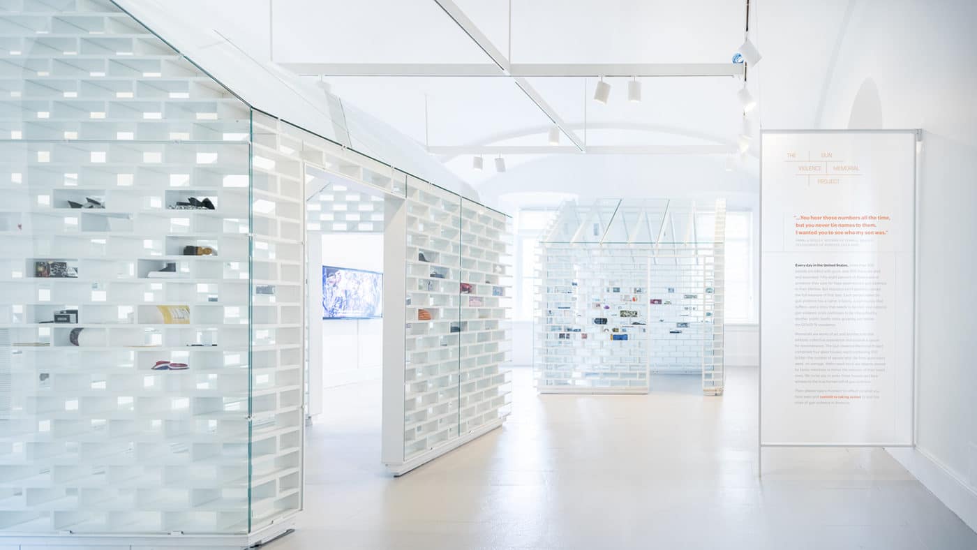 The Gun Violence Memorial Project comprises four houses, each built of 700 glass bricks, a reference to the number of people in the U.S. killed by guns every week. Over time, the bricks will continue to be filled with remembrance objects donated by immediate family members of loved ones taken by gun violence. The houses currently hold hundreds of objects—including photographs, baby shoes, graduation tassels, jewelry, a jump rope, and a prayer book—that reveal the personal narratives of each victim. Scroll down for information on how to donate.