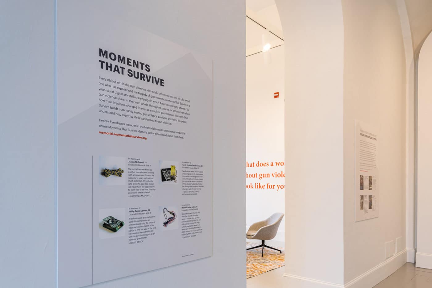 Both on-site and virtually, visitors can honor many of the lives reflected in the Gun Violence Memorial Project by exploring Moments That Survive, a digital storytelling campaign in which survivors share how their lives changed forever as a result of gun violence. Moments That Survive builds community among survivors and helps the public understand the many repercussions of gun violence. Twenty-five objects included in the Memorial are also commemorated in the online Moments That Survive Memory Wall. The installation concludes with a space of reflection and a call to action, offering visitors takeaway cards with information about local resources for survivors and allies.