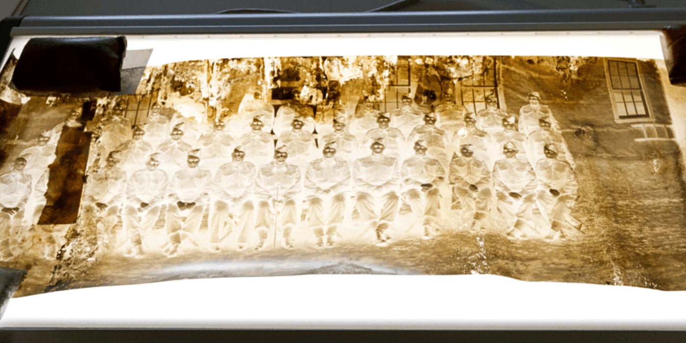 In the Museum’s 300,000+ photograph collection, several types of photographic film are preserved. One of the most unstable types of film is called cellulose nitrate. It was most commonly used between 1910 and 1950 and, when deteriorated, can appear yellowed, stained, sticky, brittle, or powdery depending on the progression of the deterioration. This deterioration is self-induced and does not proceed at an even or predictable rate across different examples of the same material. As with all chemical deterioration, there are unwanted side effects to this breakdown: irritation of the lungs and eyes, rashes, headaches, and nausea. Finally, and most worryingly, deteriorated nitrate film is highly flammable, capable of self-combusting, and can continue to burn under water. Once started, a nitrate fire can be almost impossible to put out.