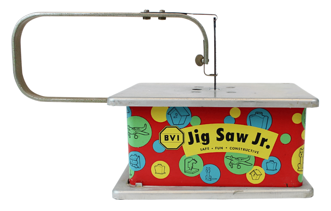 Though the bright colors on this BVI Jig Saw Jr. toy tool invite children to play with it, it hides a dangerous truth: there are no guardrails or guides to prevent the user from accidentally cutting through their fingers as easily as the saw cuts through its intended target of balsa wood. In the 1950s and 1960s, it was marketed to older children as a “safe, fun, constructive” toy, but this is no longer recommended.