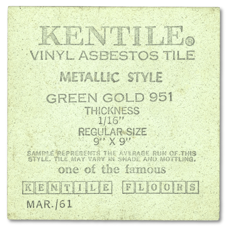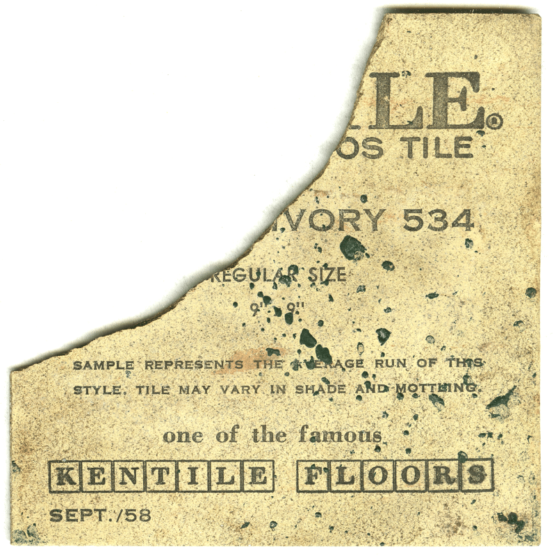 Kentile Floors produced floor tiles with an asbestos content of up to 25%. The tiles contained a combination of whole and powdered asbestos fibers. Kentile flooring was popular because it was inexpensive and easy to install, even for a do-it-yourself homeowner. The asbestos made the tiles resistant to grease, stains, and scuff marks. Despite its desirability, it was a carcinogenic product, especially during manufacture, installation, and tear down. While the Museum’s asbestos tiles are mostly in good condition, it’s important to note that broken or degrading asbestos tiles are very dangerous to handle or breathe nearby.
