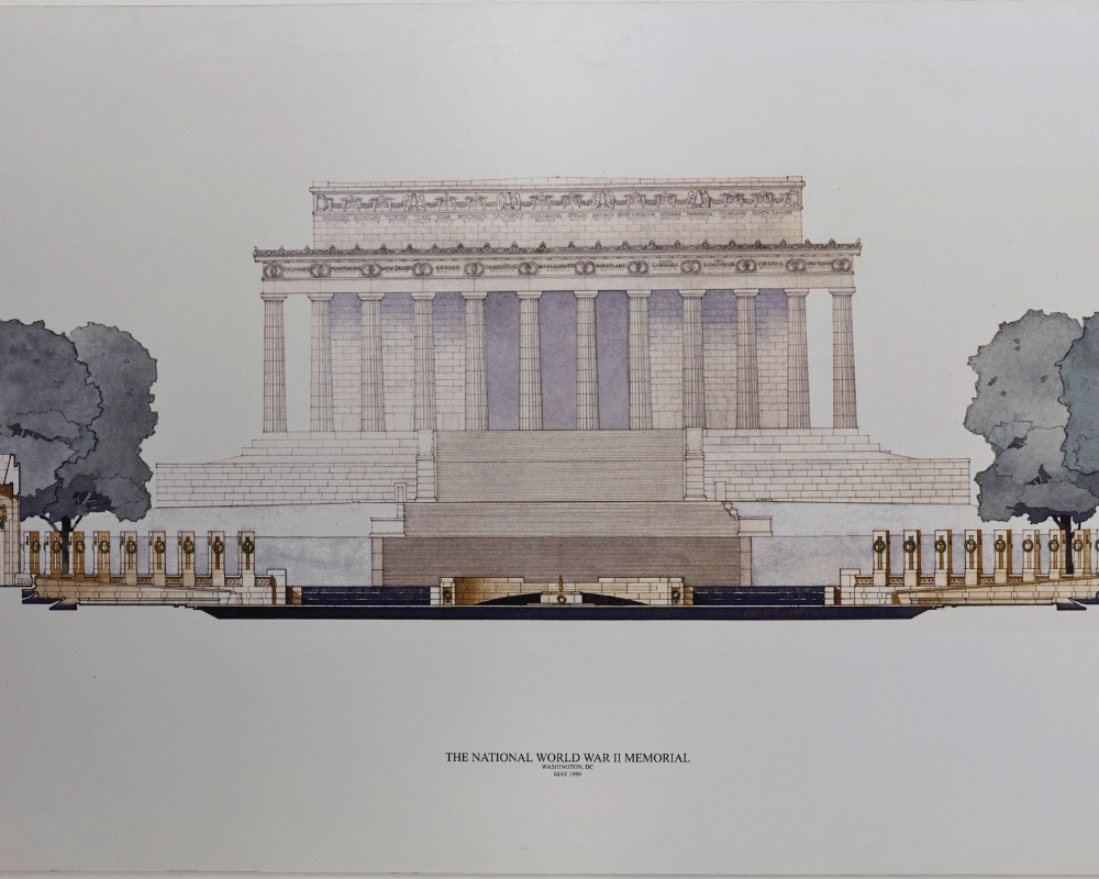 Following his passing, the family of architect Frederich St. Florian gave materials related to his work on the World War II Memorial to the Museum in early 2025. The donation includes sketches, drawings, renderings, correspondence, paperwork, and one 3D model of a proposed column design for the memorial itself. This material adds to the artifacts already held by the Museum from the Raymond Kaskey Collection featuring his sculpture work for the World War II Memorial, which was donated in 2013.