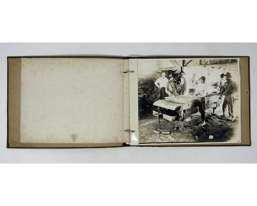 American architect and American Institute of Architects (AIA) member William A. Wage passed this unique binder of photographs down to his daughter and son-in-law upon his passing. The binder contains eleven photographs of a brick-making operation in Miami, Oklahoma between 1917 and 1925. These process photographs supplement the Museum’s extensive American Brick Collection by advancing the understanding of historic trades work in brickmaking and the techniques involved in this important construction work.