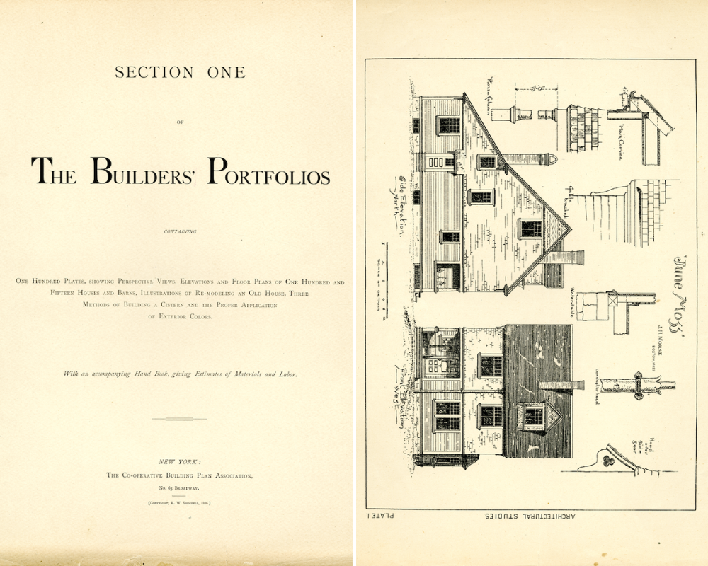 Published in 1886 by the Co-Operative Building Plan Association, The Builders’ Portfolio comprised of three volumes of architectural designs created for use by architects, builders, and real estate professionals. Thousands of homes were constructed using these plans, which were designed to provide enough detail on construction methods and pricing to help prevent financial loss. Each design includes floor plans, elevations, and exterior paint suggestions. In 2024, Melody Kris donated two of the three nearly complete portfolios, along with an accompanying price book, to the Museum’s permanent collection.