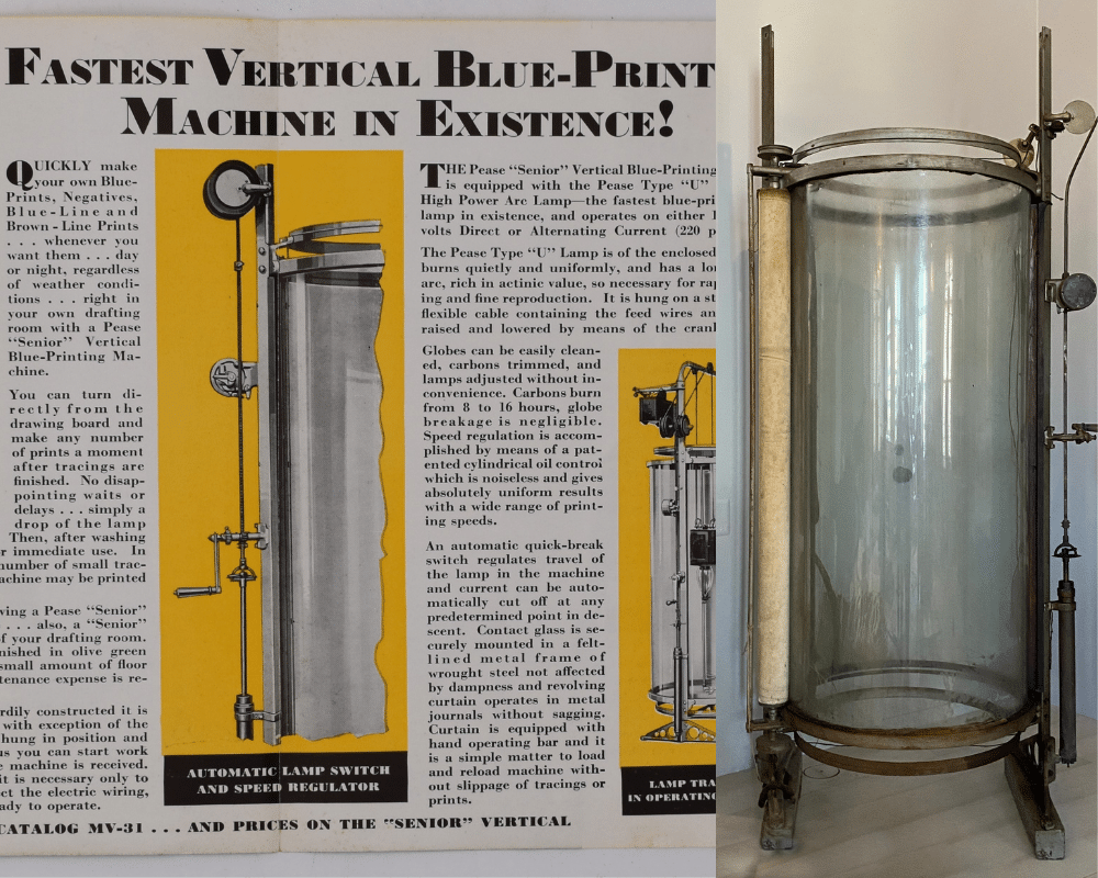 Image: Left – User manual for Senior Vertical Blue-Printing Machine, 2024.19.10; Right – Vertical Blue Printing Machine, 2024.19.1.