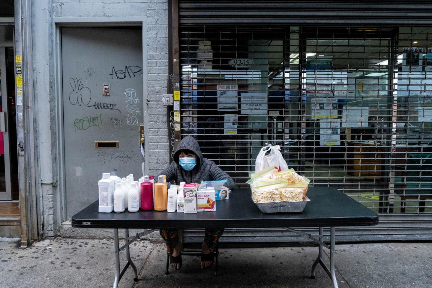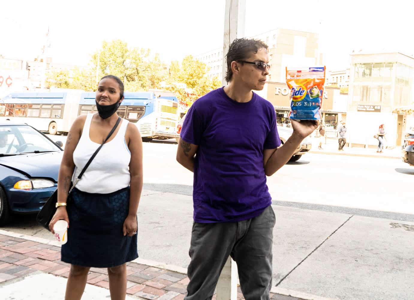 “Ocho pesos, cheap soap to wash your clothes,” said the man selling a bag of Tide on Hunts Point Avenue Next to him, a woman holding a paper cup was begging; they were trying to get some cash one way or another. I looked around for additional goods for sale but didn’t see any. After trying for a while, the couple left the spot carrying the bag of Tide with them. Bronx, September 8, 2020.