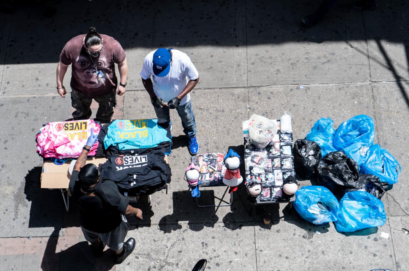 In April, at the height of the pandemic, the crowds and the vendors disappeared for a while, but by May they were back, and the most popular items were now masks, gloves, and sanitizers. The murder of George Floyd on May 25 made T-shirts and masks with “Black Lives Matter” or “I Can’t Breathe” printed on them best-sellers in African American communities.