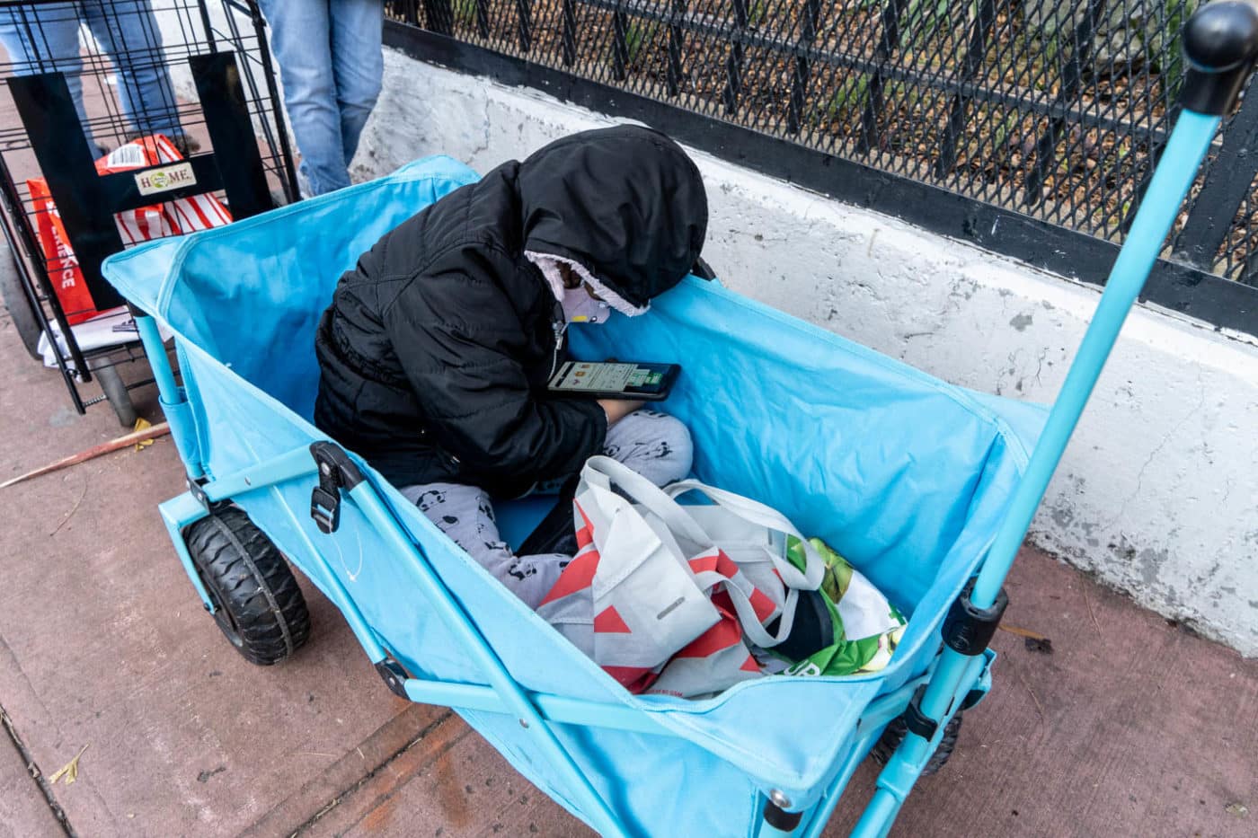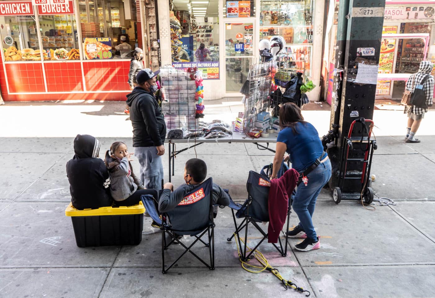 Small children’s heads pop up above a folding table, babies sleep in a stroller placed among boxes of unsold merchandise, and children play video games, as remote, online schooling is impossible with the traffic sounds and the noisy crowds.