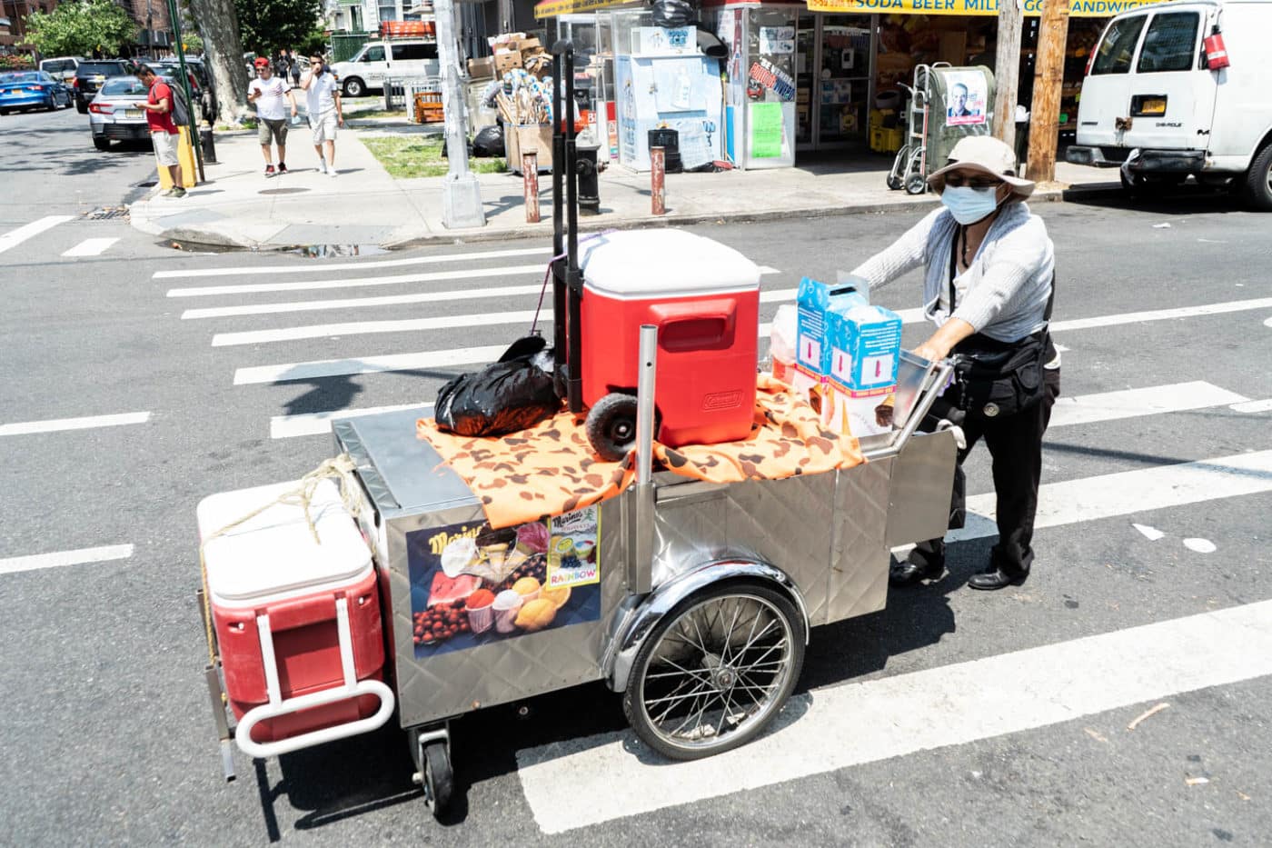 If lucky, peddlers pull their food stands with a van. Those running a small operation, such as selling bottled water, boxes of masks, or a few boxes of Advil, walk or take the subway to transport goods to their spot. Insecticide and rat-poison sellers carry their merchandise in a small box and move around yelling, “Veneno, veneno, veneno” or “las cucarachas, las cucarachas.” But most vendors use shopping carts, which allow them to move in and out of a location and to store merchandise during the day. Coolers on wheels are popular for selling foods and drinks. Milk crates, large garbage bags, and cardboard boxes are also used for storage. Plastic is used to protect the merchandise from the elements.