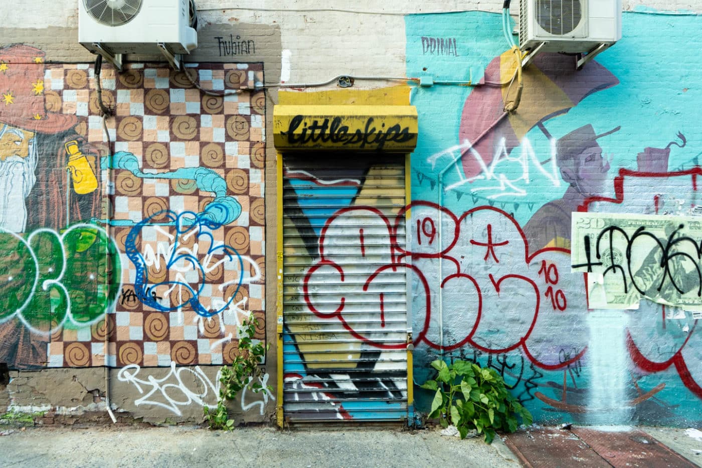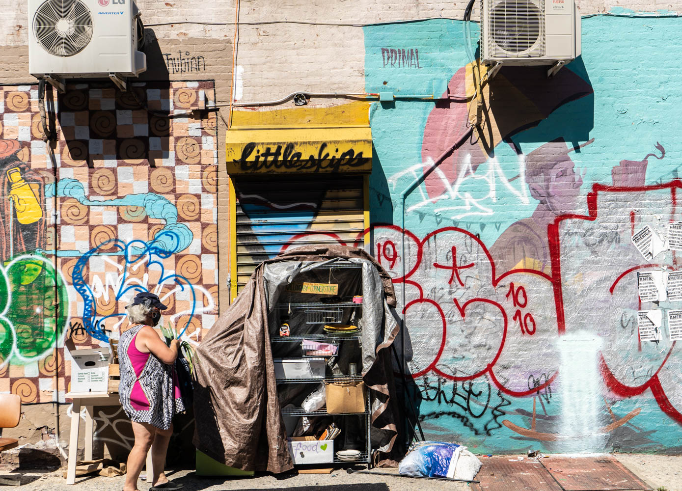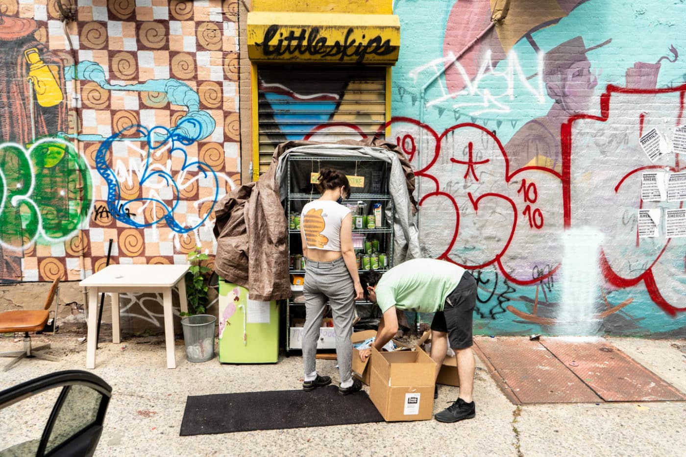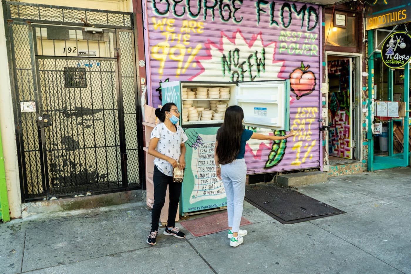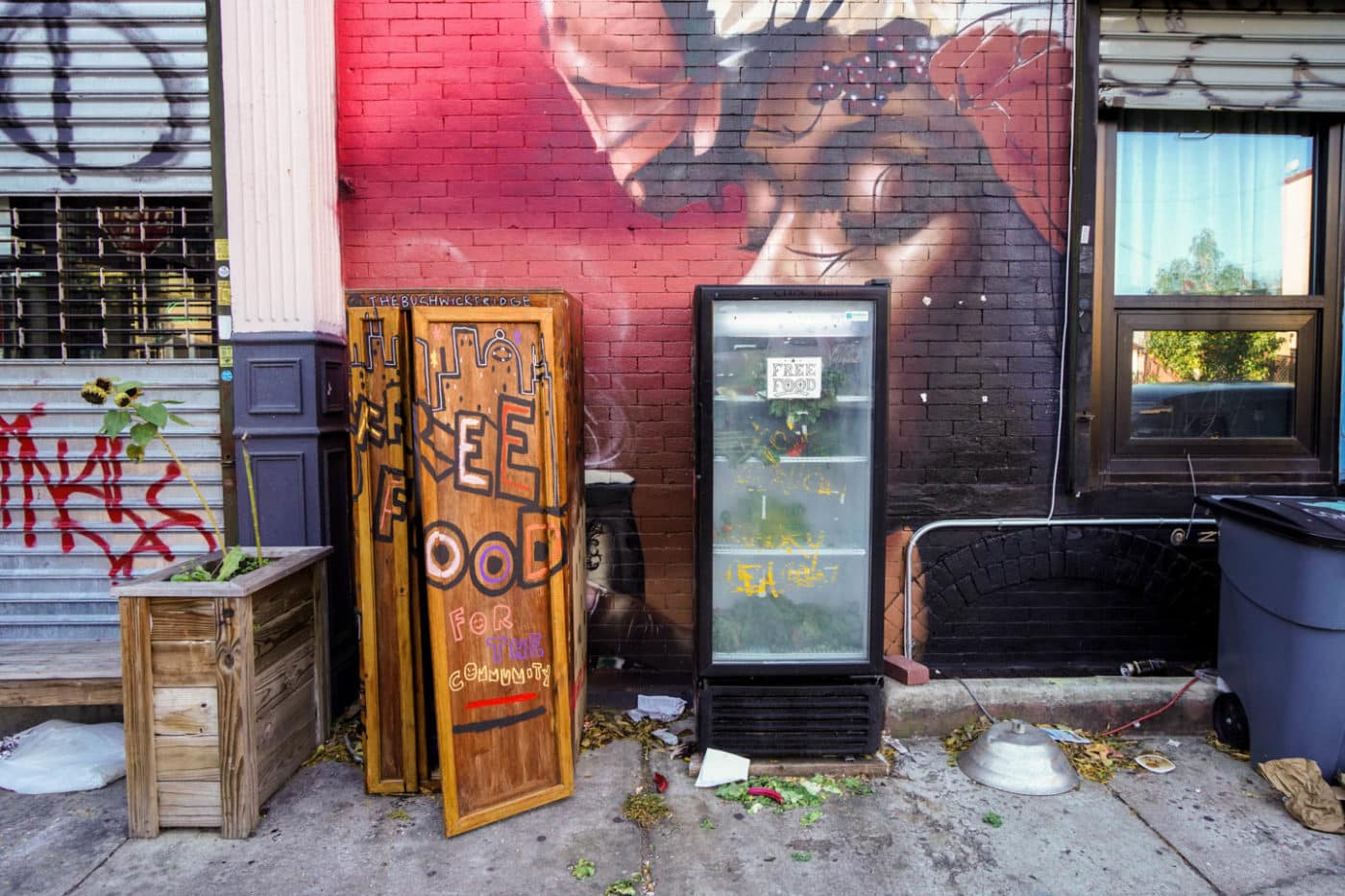 On the wall of the Willoughby Cornerstore in Brooklyn, I saw a green “community fridge” being stocked by a young couple in July. When I returned, a week later, a homeless woman was getting greens there. But by mid-August, the small pantry had disappeared; the building owner had asked them to leave. On August 24, at Little Skips East on Covert Street in Brooklyn, I photographed the Bushwick Fridge. Inside it were only three small cartons of milk, one apple, a rancid sandwich, and a large bag of tiny carrots. A note on a bulletin board requested “gloves, erase markers, and food!” Searching online for the Bushwick Fridge, I saw it fully stocked with milk, eggs, potatoes, radishes, and other items. Upon my return on November 4, the fridge was now well stocked with canned beans, soups, and greens; a sign on its door read “free food” and, in small letters below, “comida gratis.”