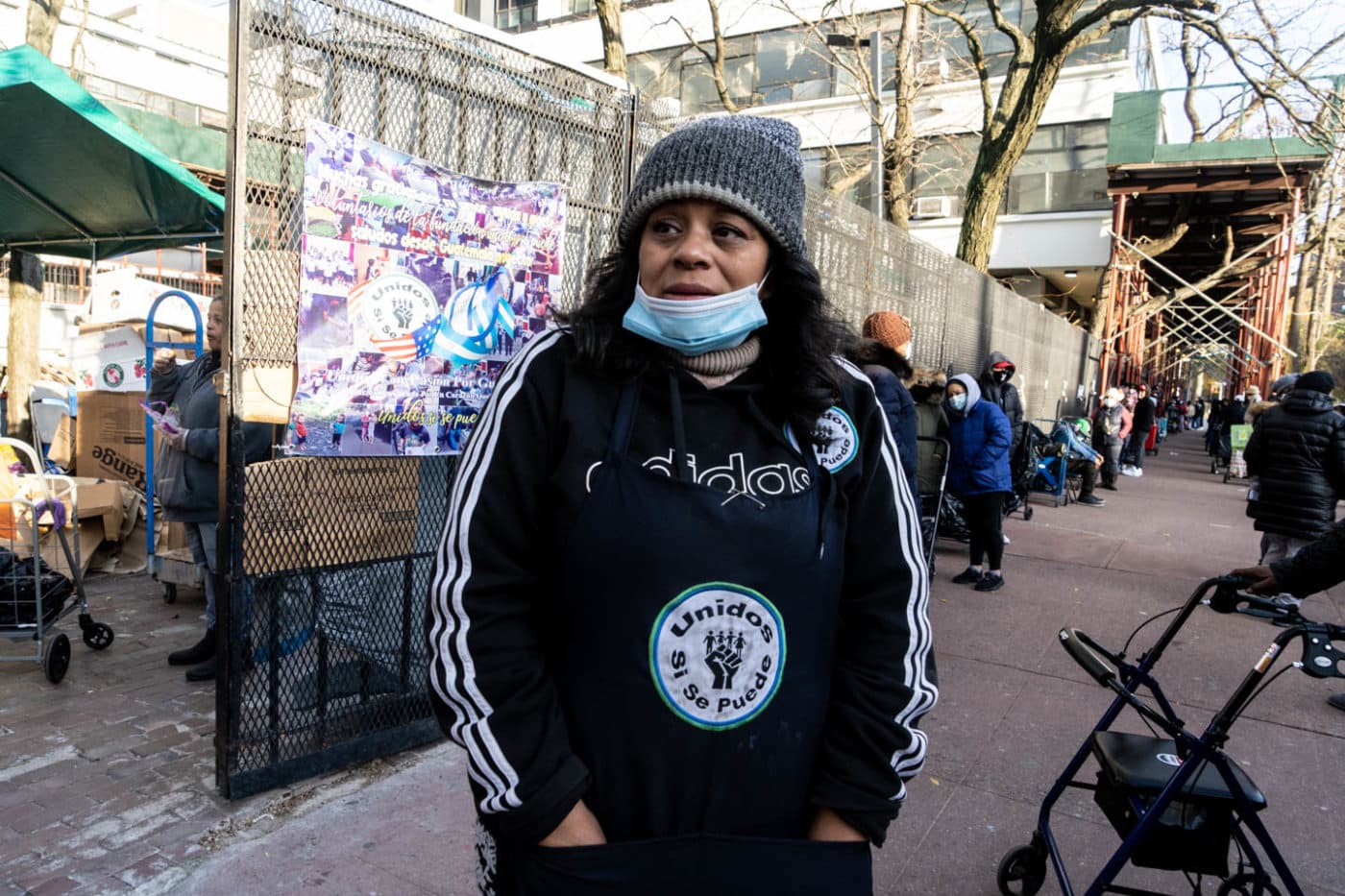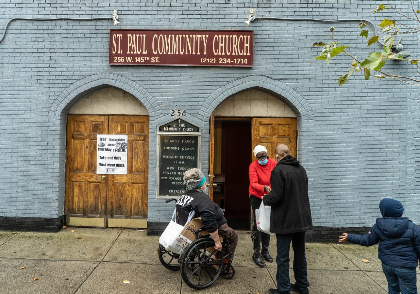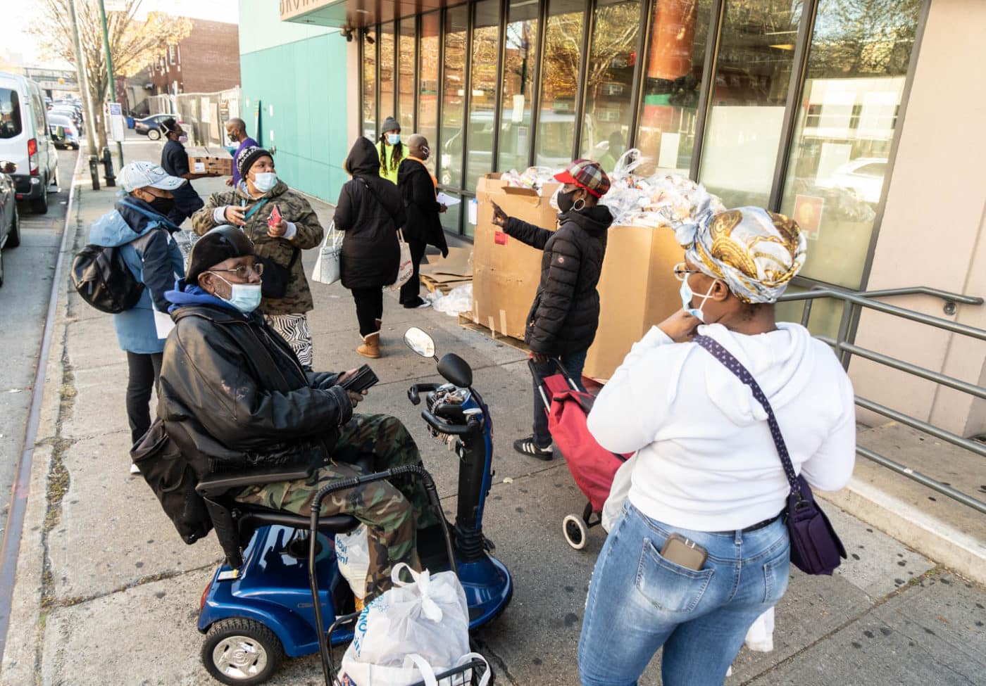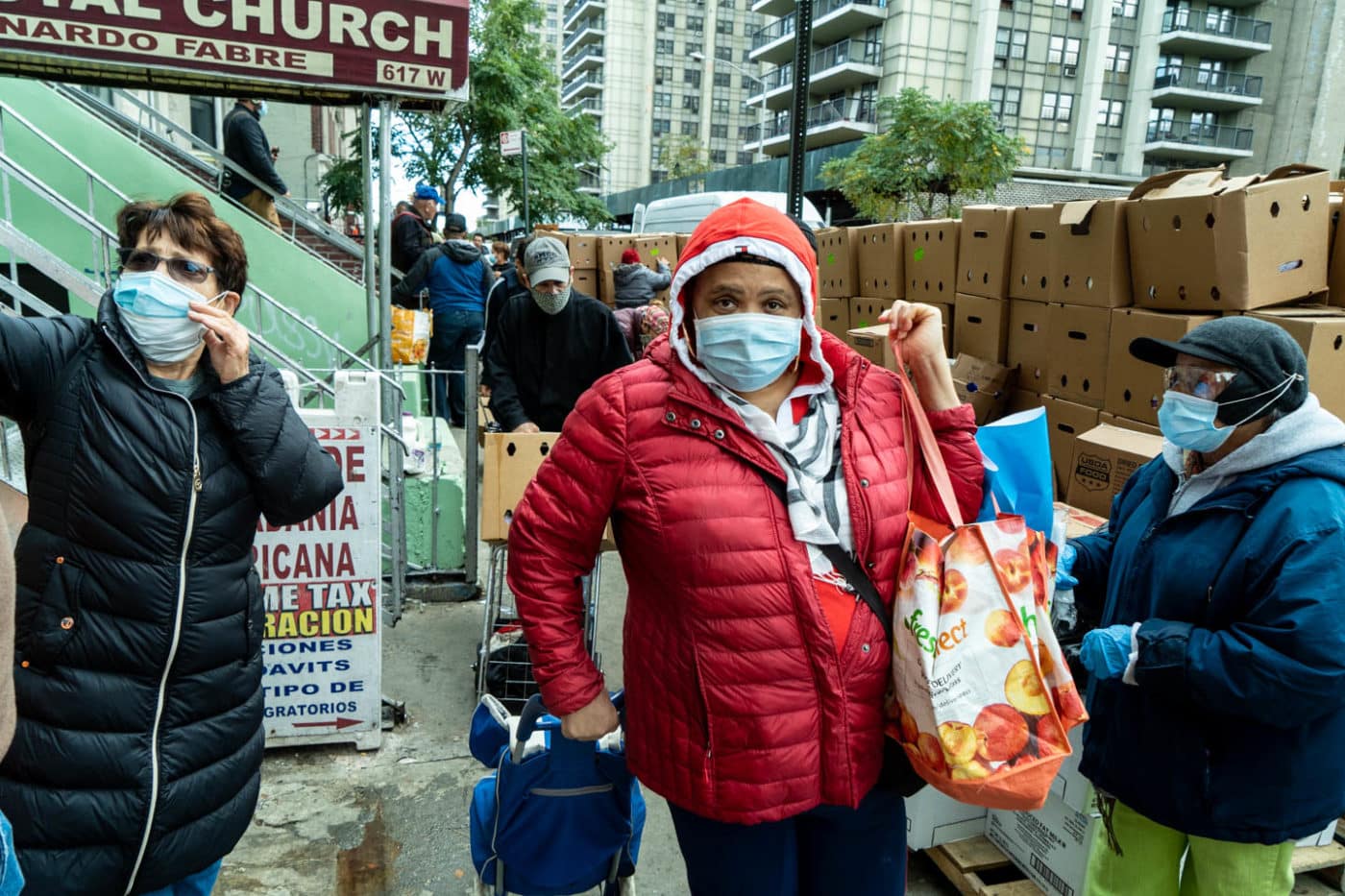 On November 17 at the International Pentecostal Church on West 179th Street in Manhattan, I saw a food line extending around the block. People were waiting with their carts to get a box filled with potatoes, apples, milk, eggs, two chorizo sausages, and onions. I saw a woman named Ana at the end of the line giving people salami and lemons, while urging those waiting in line to keep their distance, yelling, “The virus kills.” She told me that she was afraid of the coming rain. She instructed the people waiting, “The line cannot stop, it has to move forward.” At the end of the queue, a woman working for Ideal Home Health was distributing advertisements for jobs caring for the elderly and the disabled, as one job of home healthcare workers is waiting in line for food for the shut-ins in their care.