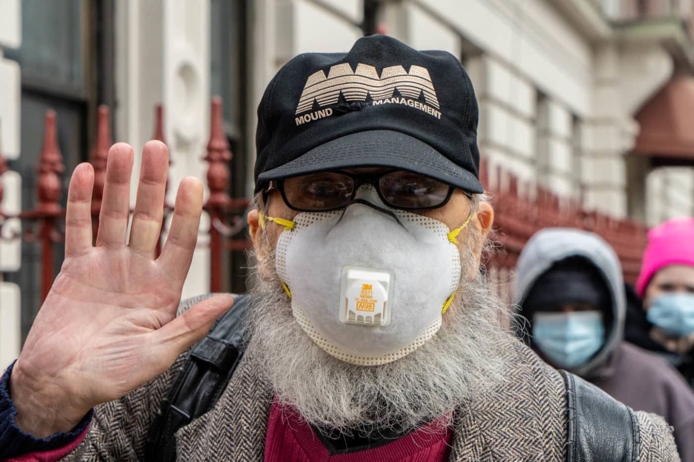 “The minister goes around giving out masks, but we don’t want masks, we want food.” Cathy, waiting in line at the United, Yes We Can food pantry, 221 East 122nd Street, Harlem, November 24, 2020.