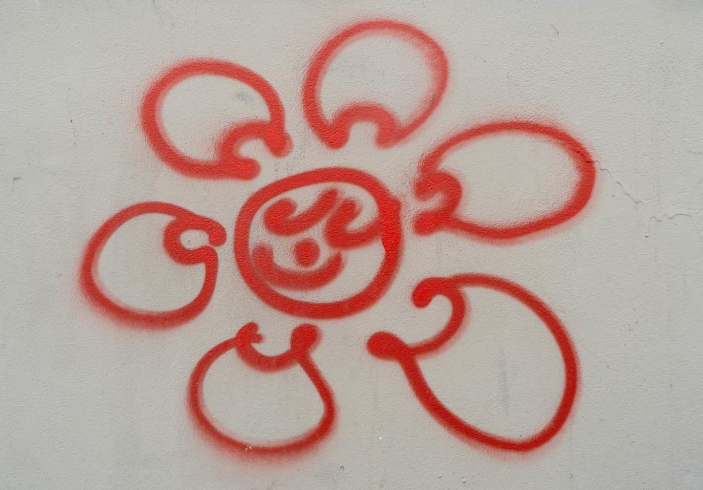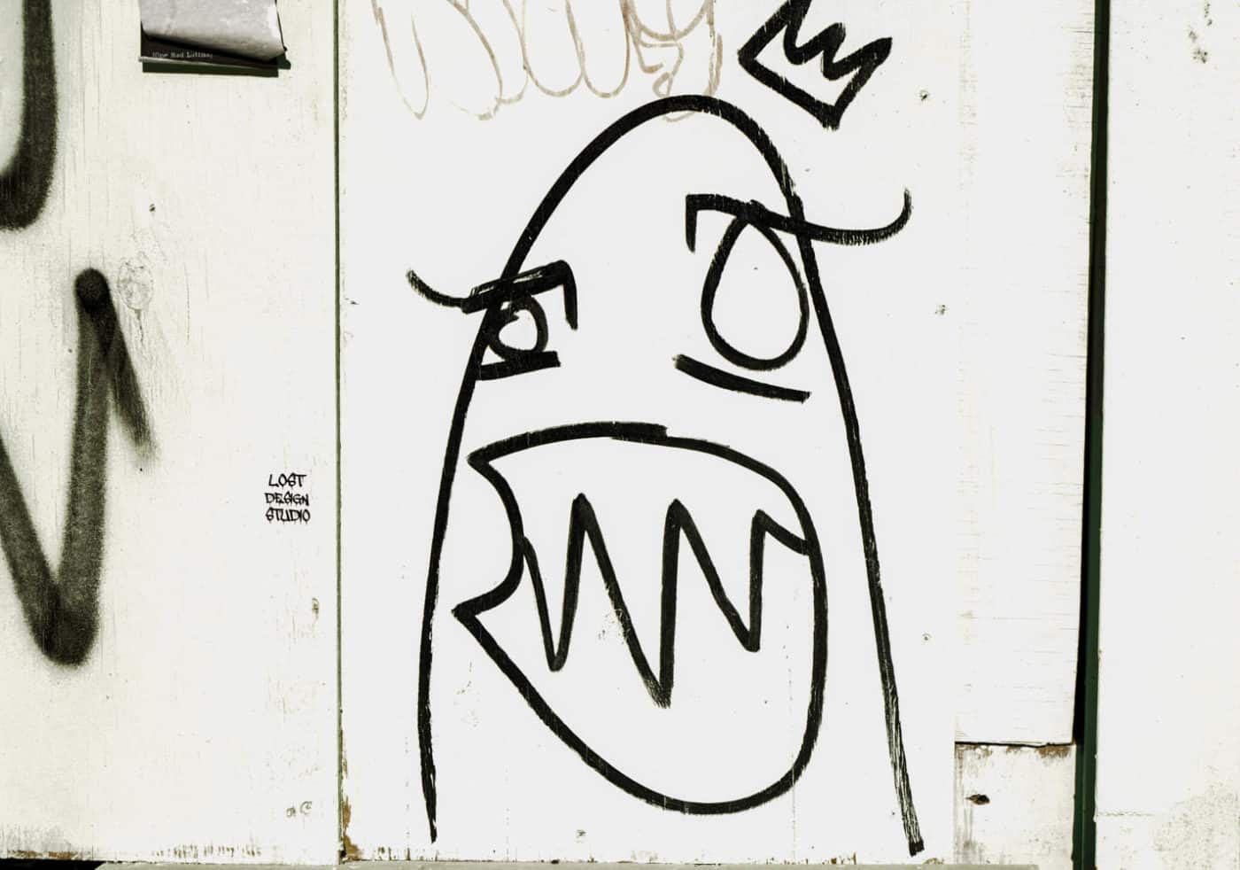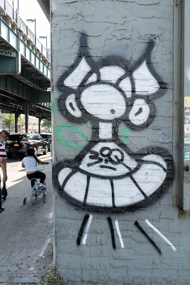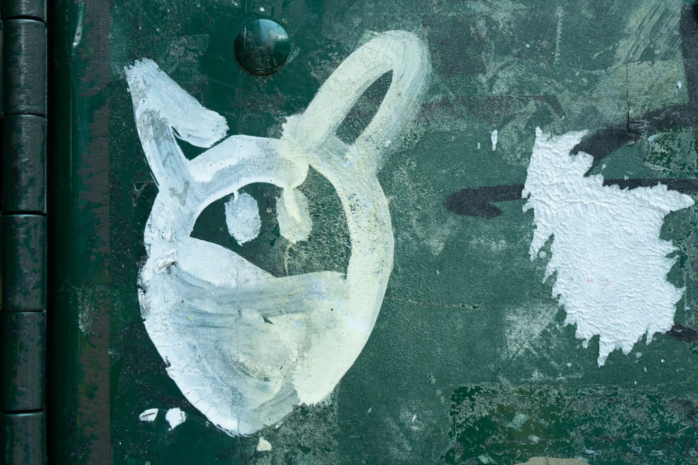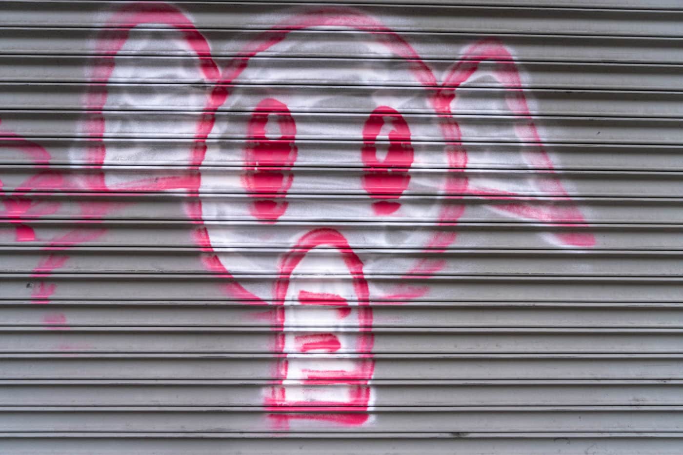 Vergara is most drawn to the more-informal graffiti scribblings of the street; modest inscriptions that emit a pulse of broader preoccupations. Is that rabbit wearing a mask? A hovering Martian, with big ears, wears one. Is that a smiling flower? Bart Simpson’s hairline? A lilting crown? Or have Covid-19’s spiky protrusions impressed their form into the collective consciousness and now lurk around every corner, sometimes shedding droplets as it spreads?