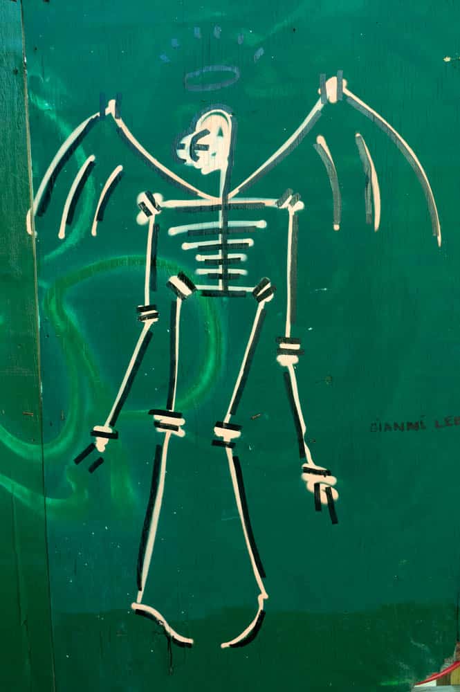 As in his past projects, Vergara is drawn to street art and graffiti as indications of public sentiment. Restaurants and businesses sponsor vivacious drawings on storefront grates that glamorize PPE and physical distancing. A number of the tags proliferate across the city; and poetic images appear, shamanic talismans like the Angel of Death.