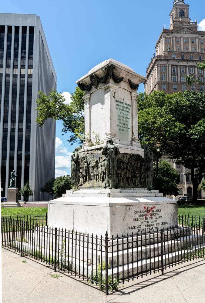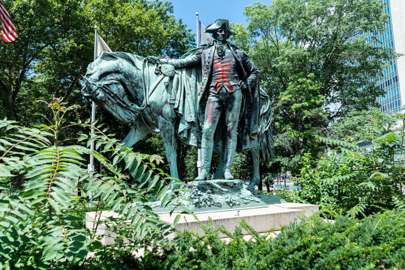 2020 has been a year of reckoning with public memory. Around the U.S., #BlackLivesMatter protestors have toppled prominent public memorials to colonizers, slave owners, Confederate generals, and white supremacists. Nearly everywhere, graffiti artists have tagged sculptures, using brightly colored spray paint to turn bronze statuary and granite plinths into symbols of outrage rather than of past glory. In Newark’s Washington Park, the pedestal that once held a statue of Christopher Columbus is empty, having been removed by the city to save it from destruction. Nearby, an equestrian statue of George Washington has been canceled through the simple act of spray painting.