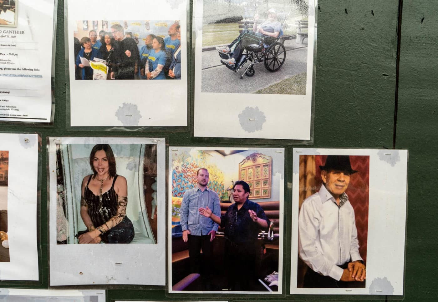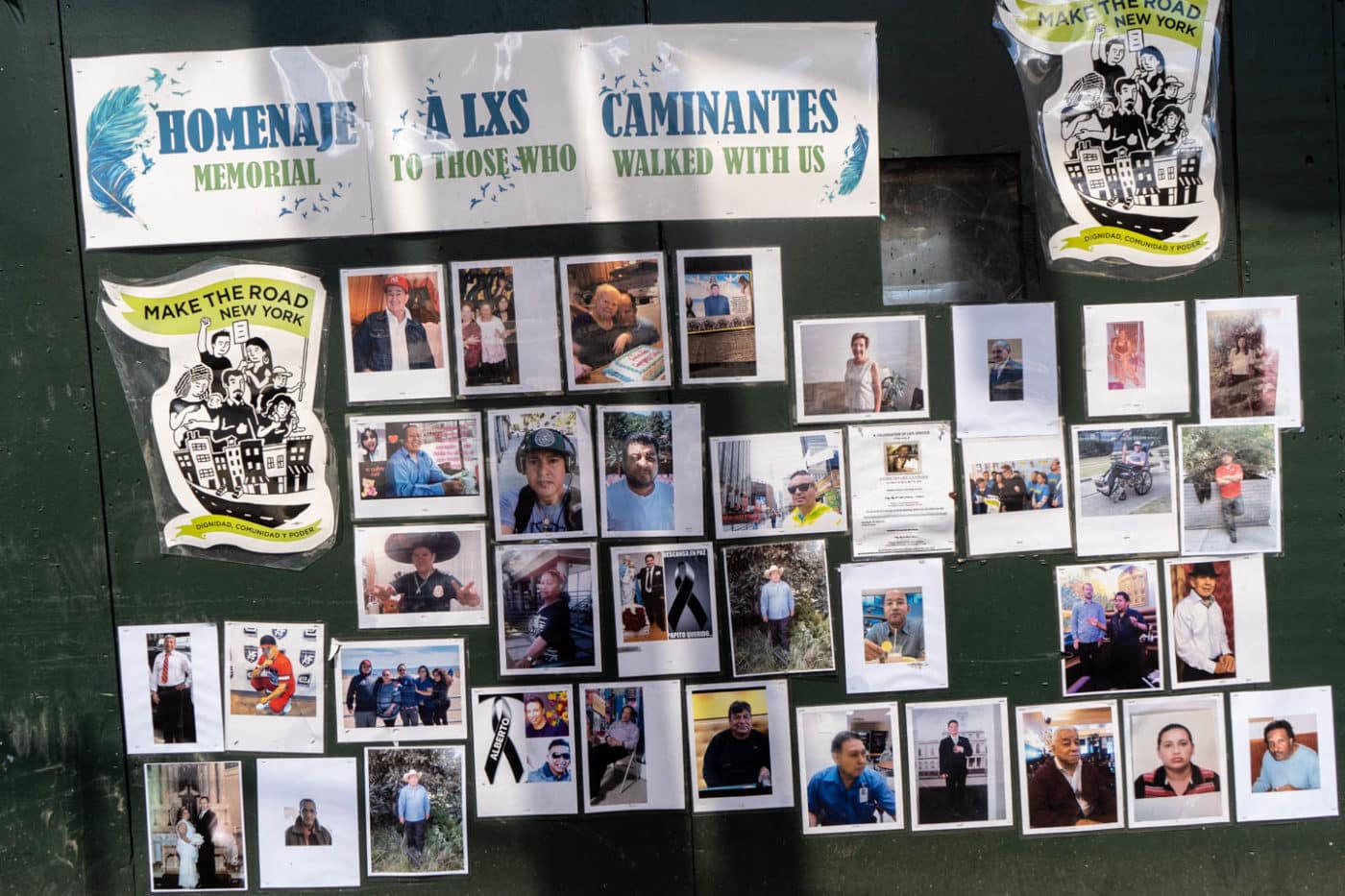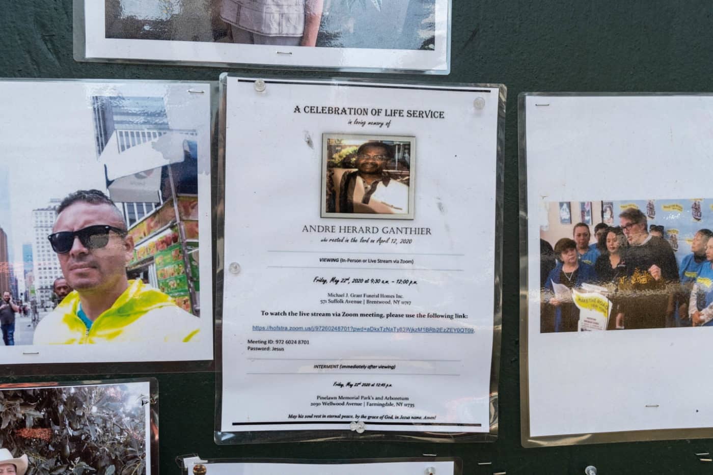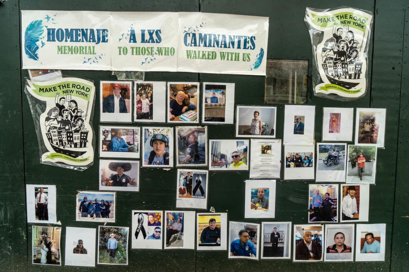 July 5, 2020: While there are thousands of portraits of victims of the pandemic online, it’s rare to see them on the walls of buildings along busy urban crossroads. One notable exception is a group of 30 color photocopies placed on a wooden fence at 104-21 Roosevelt Avenue, Queens. The exhibit is sponsored by Make the Road New York, a community organization. Labeled “Memorial to Those Who Walked With Us,” the pictures depict young and old enjoying life in their homes, places of work, and on city streets. The wall has attracted those who want to affix portraits of their loved ones in a public place, prompting Make the Road to add a note in English and Spanish saying, “DO NOT put pictures without family approval.”