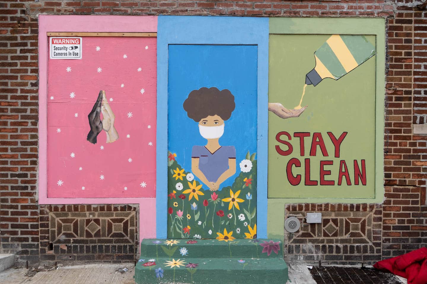 September 16, 2020: Mural giving advice to prevent the spread of Covid-19, Chestnut Street at Pitkin Avenue, Brooklyn, New York. © Camilo José Vergara