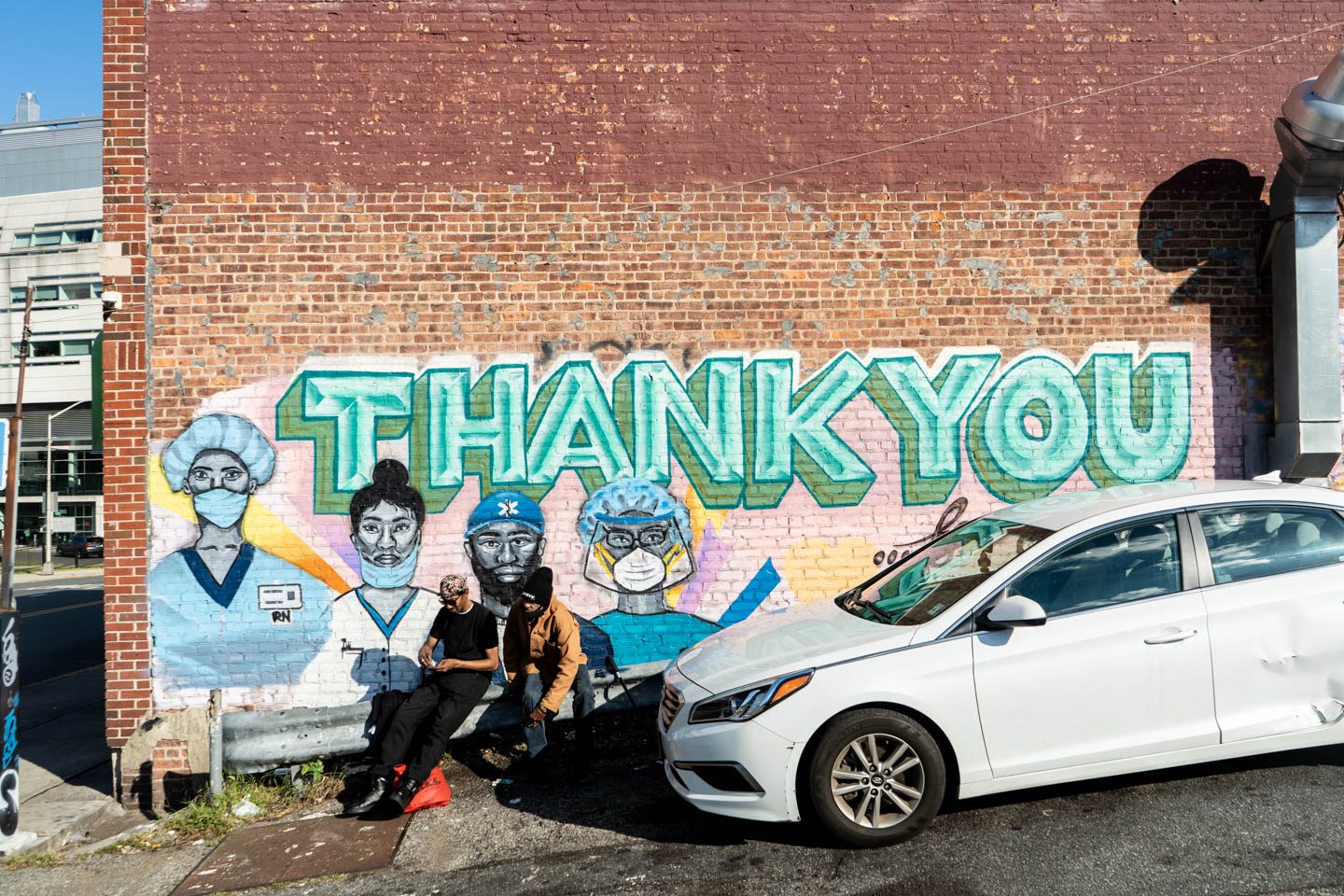 September 30, 2020: Thank You to Hospital Workers mural by the Down Neck Arts Collective; adjacent to University Hospital on South Orange Avenue at Bergen Street, Newark, New Jersey. © Camilo José Vergara