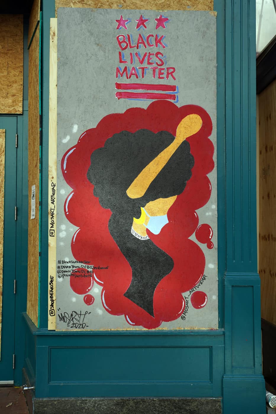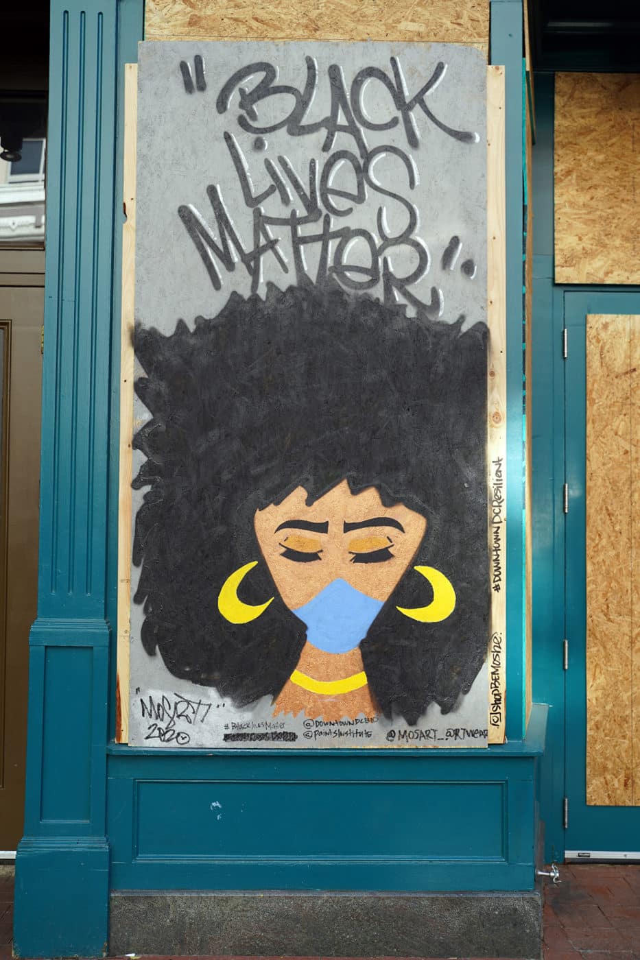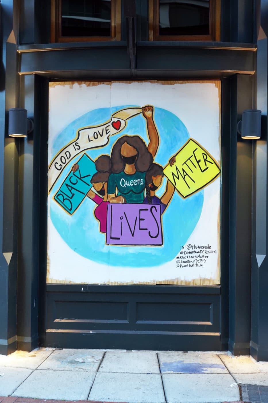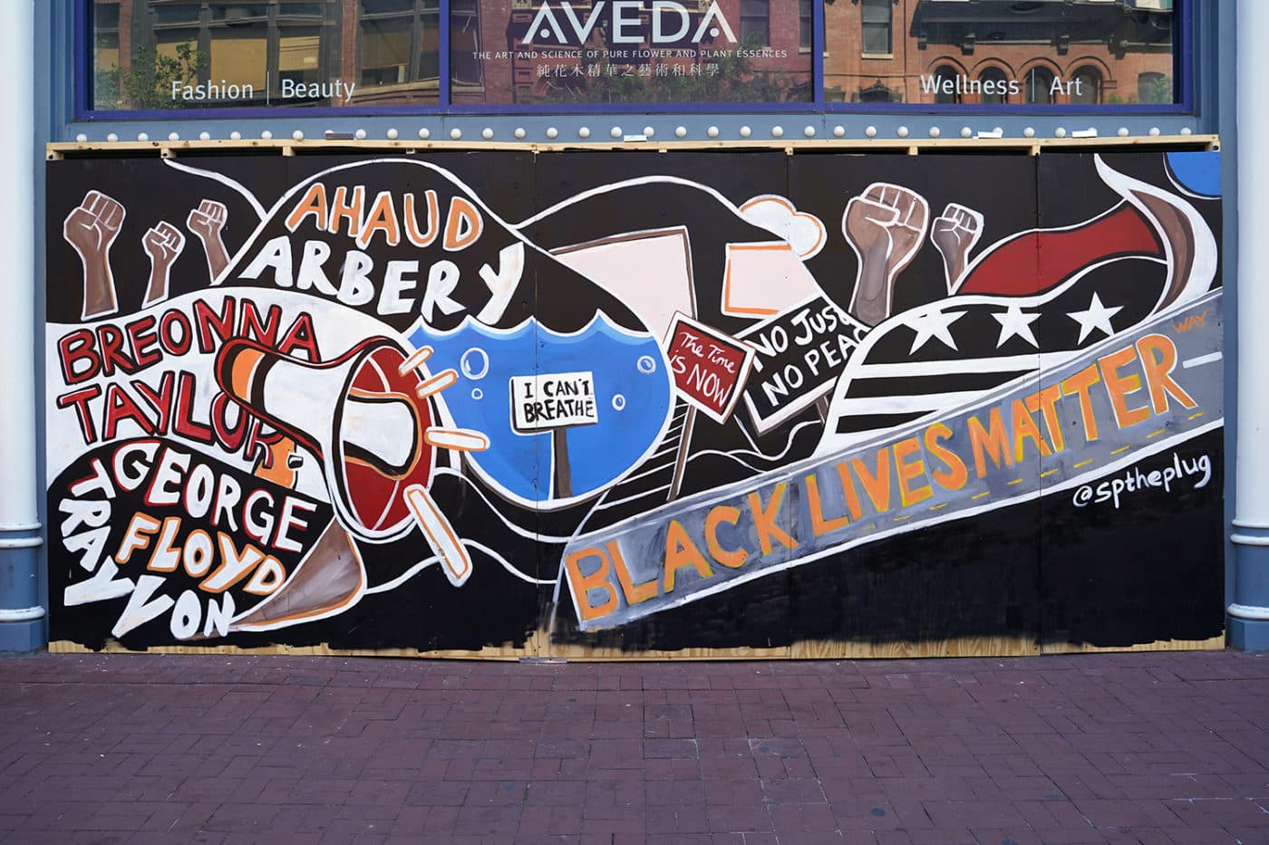 In June 2020, amid an unprecedented global pandemic, protesters took to the streets of Washington, D.C., in response to the murder of George Floyd—and Breonna Taylor, and Ahmaud Arbery, and so many others who came before. To capture the historic moment, the DowntownDC BID worked with the P.A.I.N.T.S. Institute to commission dozens of murals for boarded-up storefronts. (The organization’s acronym stands for “Providing Artists with Inspiration in Non-Traditional Settings.”) The public experience of these plywood barriers, now reframed through vibrant art, shifted from “stay away” to “come look.” The Gallery Place neighborhood was transformed with artworks that expressed love, unity, and hope; that spoke to racial injustice and societal inequities; and that proclaimed support for the Black Lives Matter movement. Murals That Matter displays 18 of those murals.