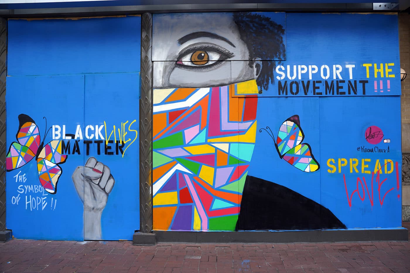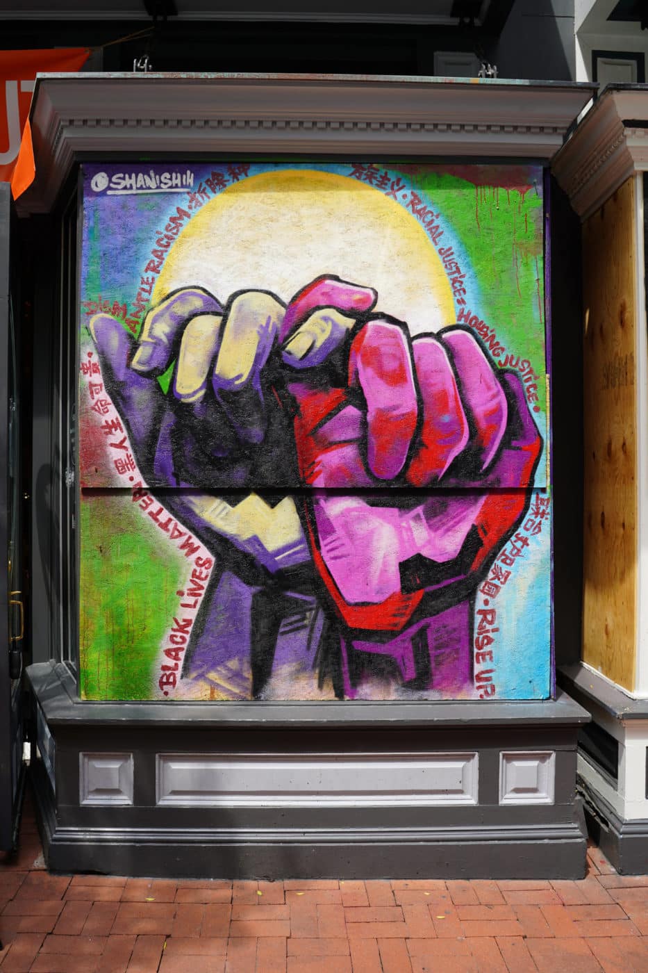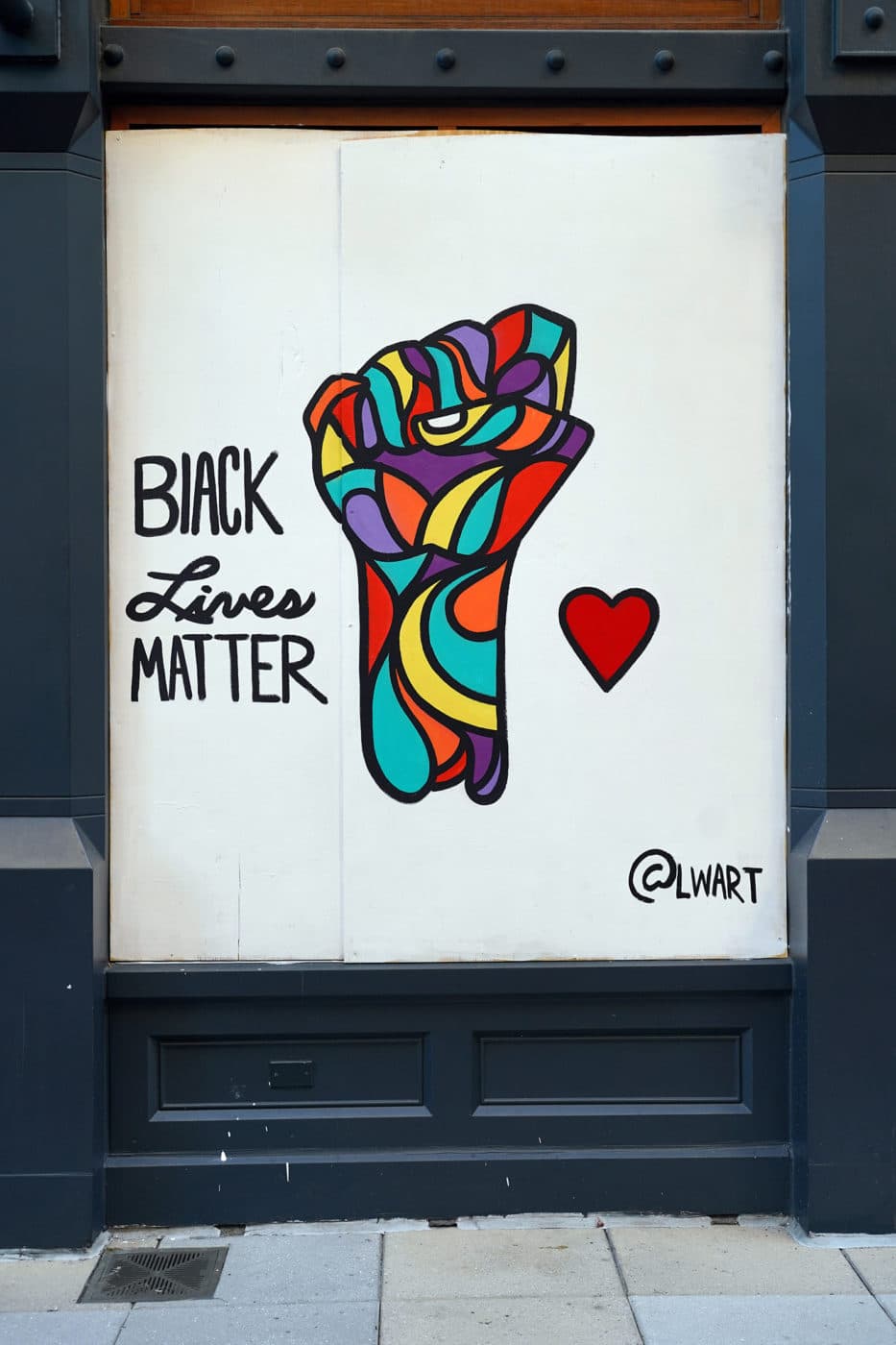 In June 2020, amid an unprecedented global pandemic, protesters took to the streets of Washington, D.C., in response to the murder of George Floyd—and Breonna Taylor, and Ahmaud Arbery, and so many others who came before. To capture the historic moment, the DowntownDC BID worked with the P.A.I.N.T.S. Institute to commission dozens of murals for boarded-up storefronts. (The organization’s acronym stands for “Providing Artists with Inspiration in Non-Traditional Settings.”) The public experience of these plywood barriers, now reframed through vibrant art, shifted from “stay away” to “come look.” The Gallery Place neighborhood was transformed with artworks that expressed love, unity, and hope; that spoke to racial injustice and societal inequities; and that proclaimed support for the Black Lives Matter movement. Murals That Matter displays 18 of those murals.