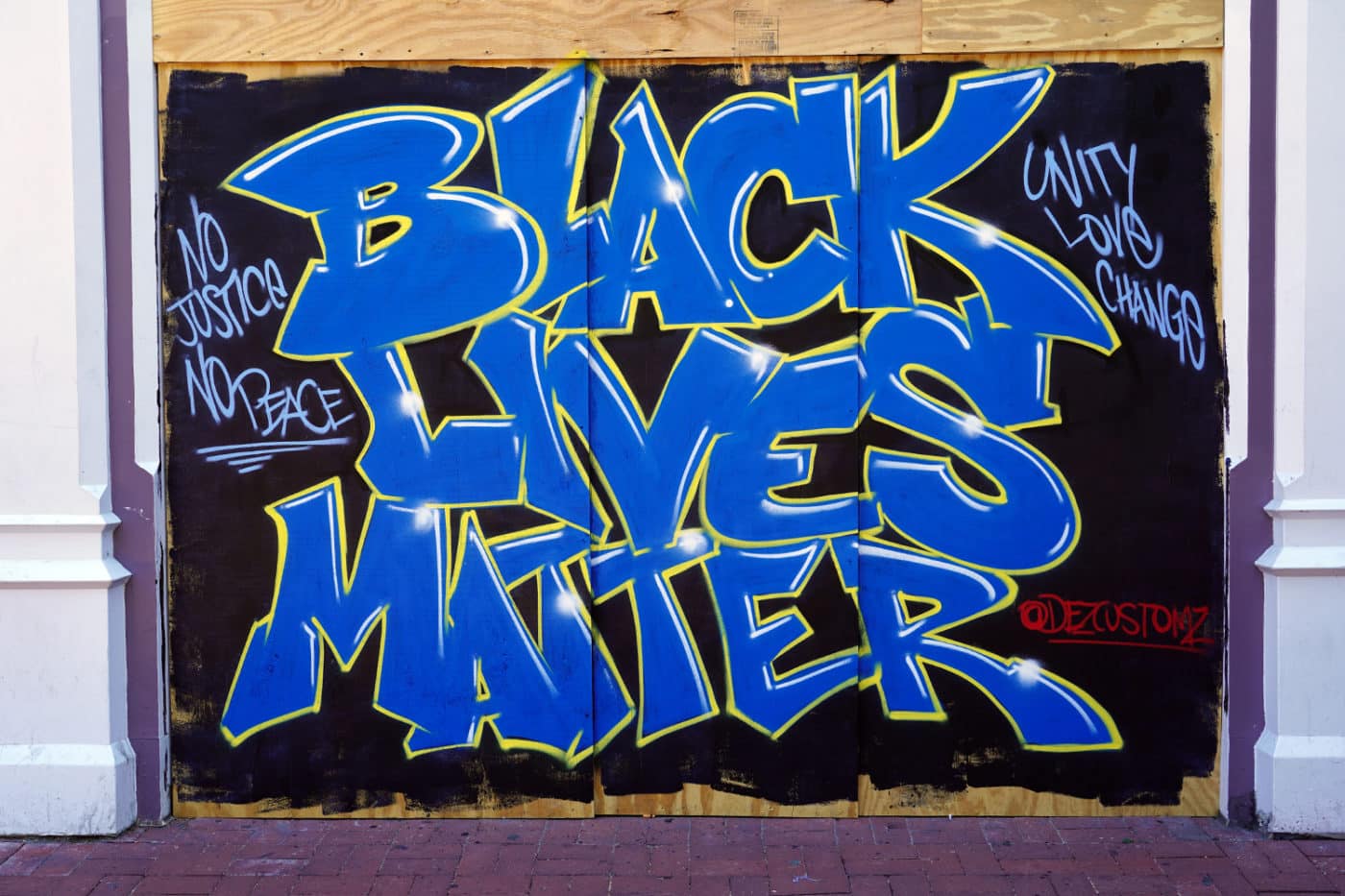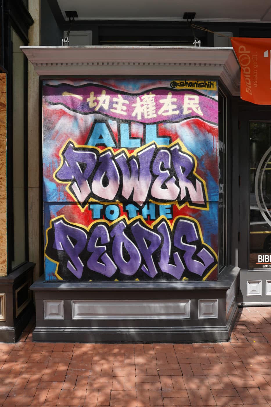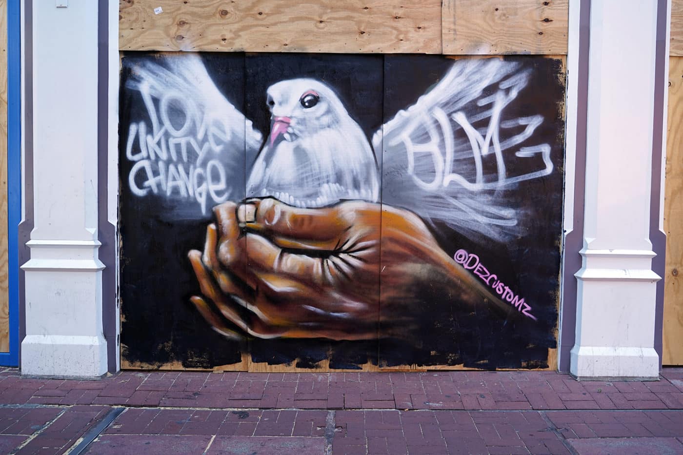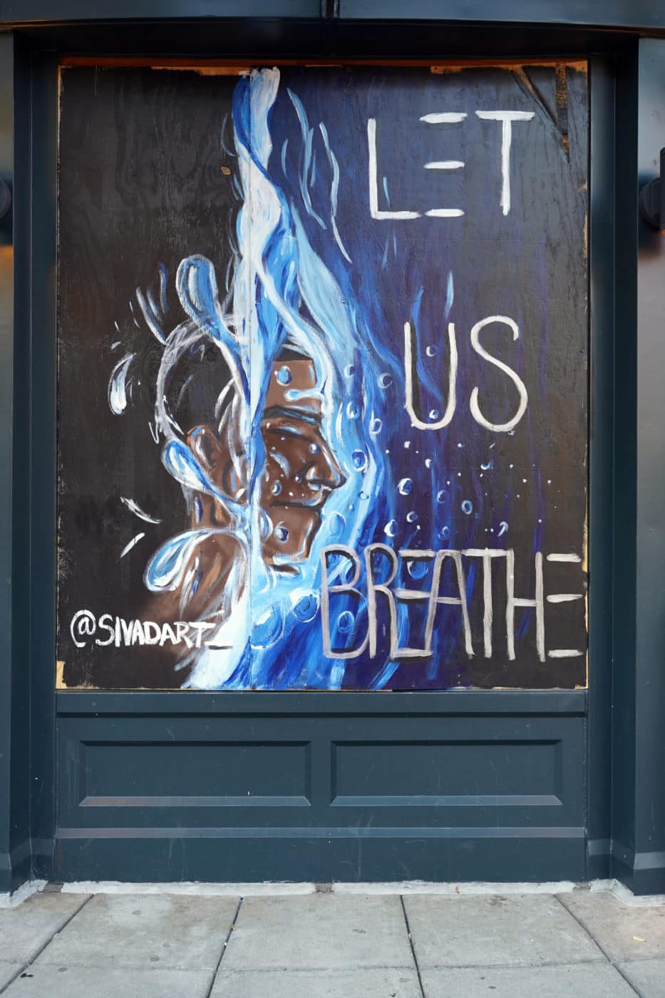 In June 2020, amid an unprecedented global pandemic, protesters took to the streets of Washington, D.C., in response to the murder of George Floyd—and Breonna Taylor, and Ahmaud Arbery, and so many others who came before. To capture the historic moment, the DowntownDC BID worked with the P.A.I.N.T.S. Institute to commission dozens of murals for boarded-up storefronts. (The organization’s acronym stands for “Providing Artists with Inspiration in Non-Traditional Settings.”) The public experience of these plywood barriers, now reframed through vibrant art, shifted from “stay away” to “come look.” The Gallery Place neighborhood was transformed with artworks that expressed love, unity, and hope; that spoke to racial injustice and societal inequities; and that proclaimed support for the Black Lives Matter movement. Murals That Matter displays 18 of those murals.