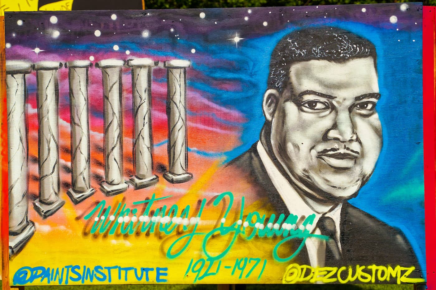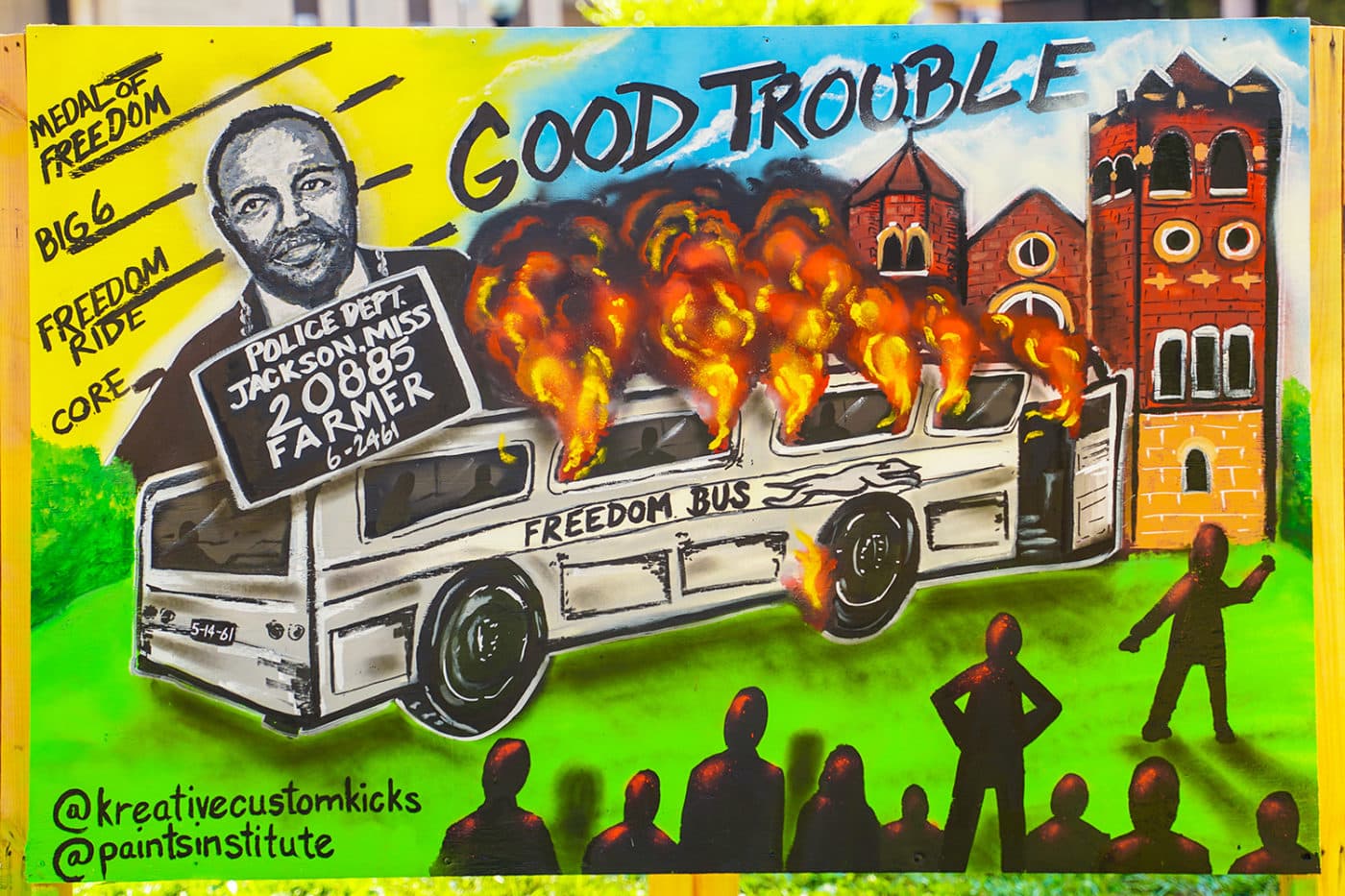 In a celebration of the life and legacy of the late Rep. John Lewis, a towering figure of the Civil Rights movement, six artists have created murals commemorating the members of the “Big Six” who organized the original March on Washington in 1963: John Lewis, Chairman, Student Non-Violence Coordinating Committee; Whitney Young, National Director, Urban League; A. Philip Randolph, President, Negro American Labor Council; Martin Luther King Jr., President, Southern Christian Leadership Conference; James Farmer, Director, Congress of Racial Equality; Roy Wilkins, Executive Secretary, National Association for the Advancement of Colored People. These murals, painted live on August 28 and 29, are now part of the exhibition.