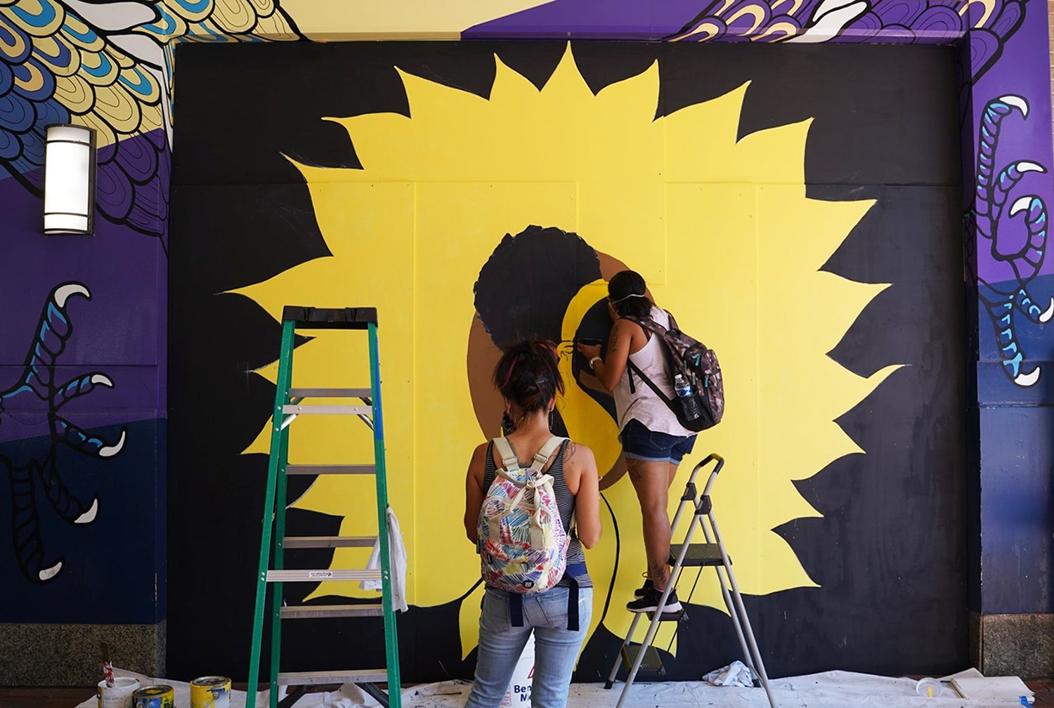 Top photo: Gallery Place Mural in progress. Image courtesy DowntownDC BID.