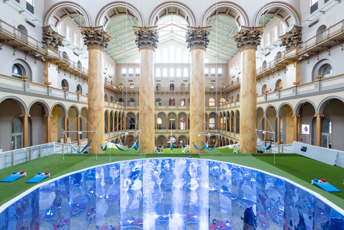 The centerpiece of the lounging areas are interactive hammocks suspended from the 100-foot-tall ceiling grid. The hammocks contain hidden speakers programmed with audio from prominent American storytellers, sharing summertime memories.