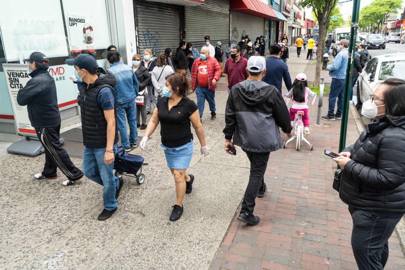 The city has always been a center of commerce, and this is especially true at the Crossroads. Many establishments were closed; but for those that were open—groceries, markets, pharmacies, food pantries, banks, testing centers, and urgent-care facilities—the “New Normal” meant waiting in line. Handmade signs attempted to communicate social distancing and implored shoppers to wear masks. Markings appeared on the sidewalk to regulate the queues. In some cases, enforcers were deployed in full-body plastic suits and with red “Stop” signs; they worked valiantly to maintain order. Temporary tents were erected at testing centers like the one in Elmhurst, Queens, where enforcers ran a tight ship and broadcasted confidence that the zone was under control and that chaos would not be tolerated.