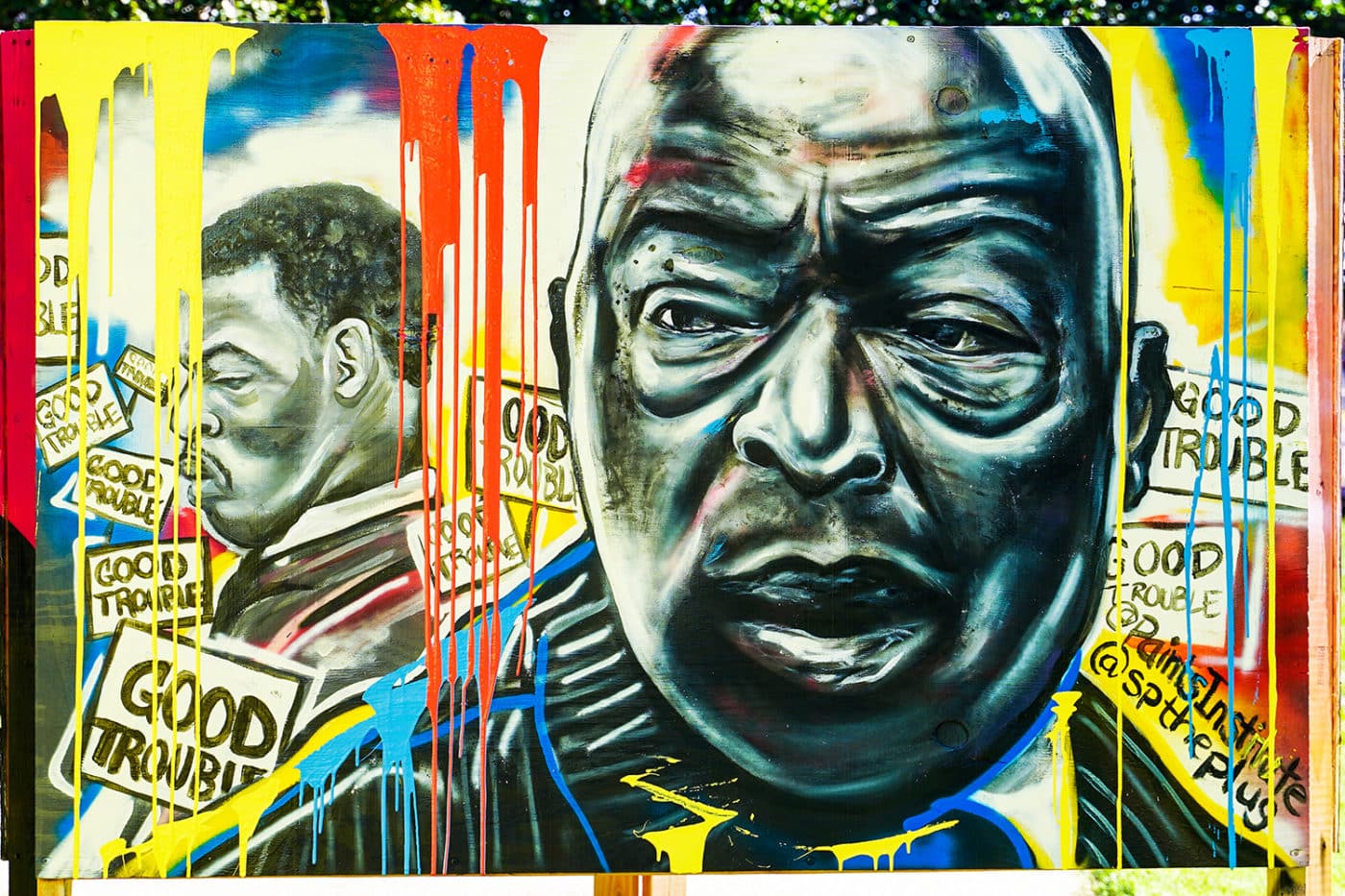 In a celebration of the life and legacy of the late Rep. John Lewis, a towering figure of the Civil Rights movement, six artists have created murals commemorating the members of the “Big Six” who organized the original March on Washington in 1963: John Lewis, Chairman, Student Non-Violence Coordinating Committee; Whitney Young, National Director, Urban League; A. Philip Randolph, President, Negro American Labor Council; Martin Luther King Jr., President, Southern Christian Leadership Conference; James Farmer, Director, Congress of Racial Equality; Roy Wilkins, Executive Secretary, National Association for the Advancement of Colored People. These murals, painted live on August 28 and 29, are now part of the exhibition.