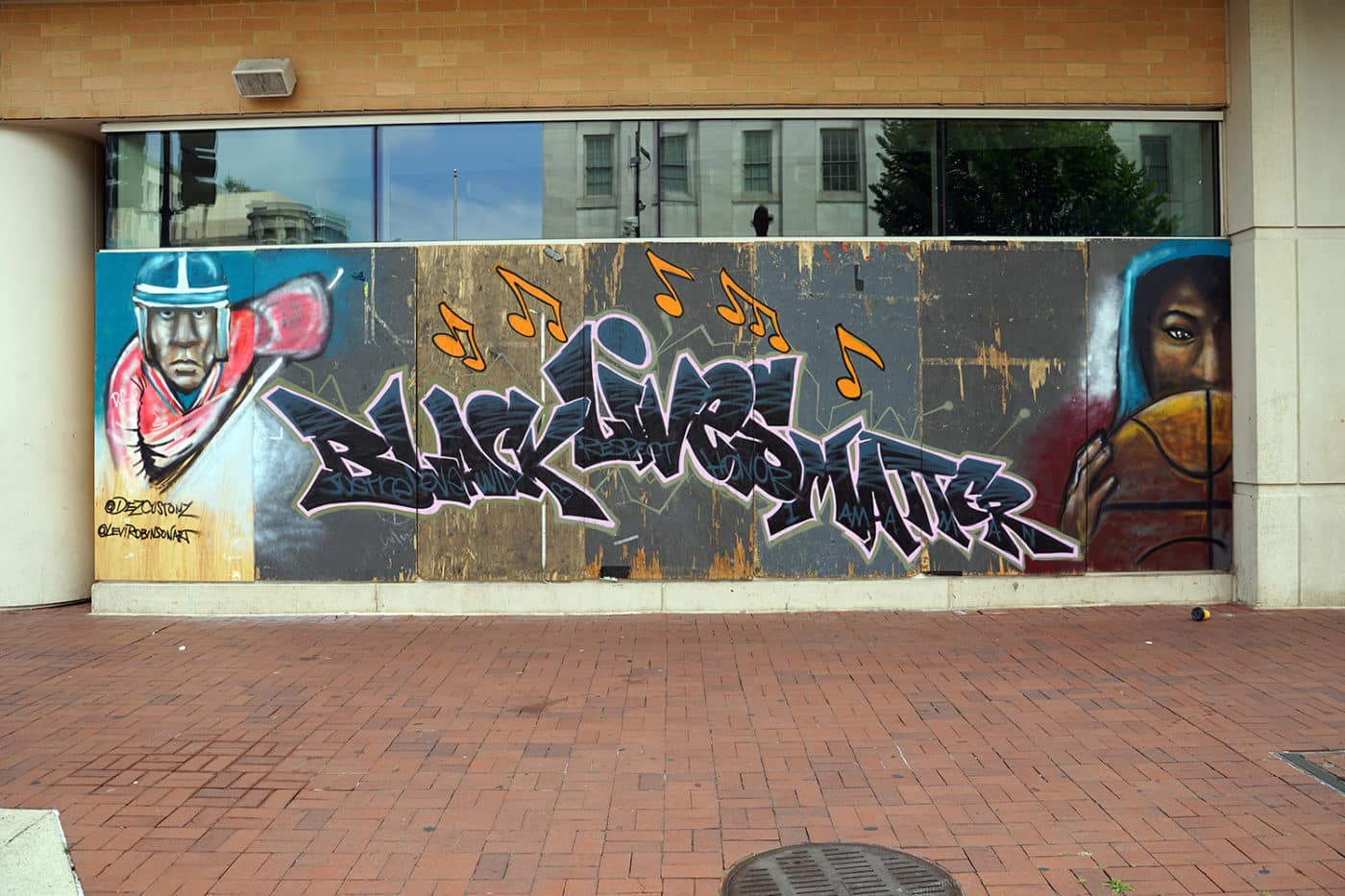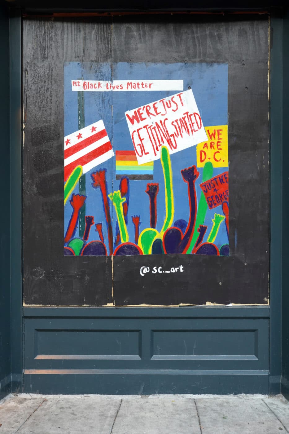 In June 2020, amid an unprecedented global pandemic, protesters took to the streets of Washington, D.C., in response to the murder of George Floyd—and Breonna Taylor, and Ahmaud Arbery, and so many others who came before. To capture the historic moment, the DowntownDC BID worked with the P.A.I.N.T.S. Institute to commission dozens of murals for boarded-up storefronts. (The organization’s acronym stands for “Providing Artists with Inspiration in Non-Traditional Settings.”) The public experience of these plywood barriers, now reframed through vibrant art, shifted from “stay away” to “come look.” The Gallery Place neighborhood was transformed with artworks that expressed love, unity, and hope; that spoke to racial injustice and societal inequities; and that proclaimed support for the Black Lives Matter movement. Murals That Matter displays 18 of those murals.